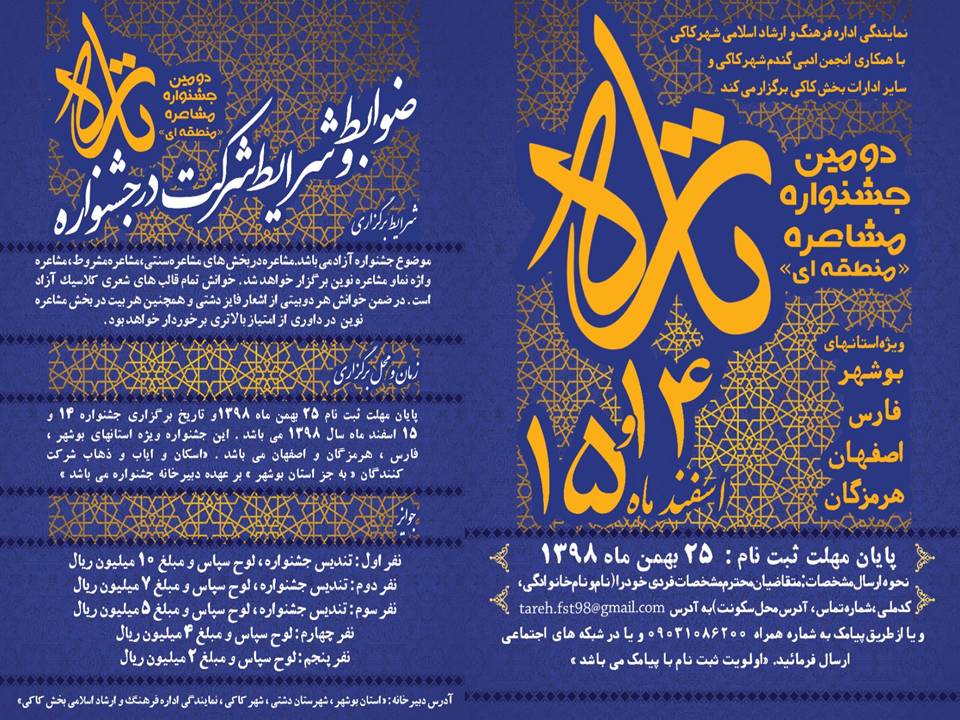 زارعی، رئیس اداره فرهنگ و ارشاد اسلامی شهرستان دشتی: فراخوان برگزاری دومین جشنواره منطقهای مشاعره «تاره» در کاکی منتشر شد.